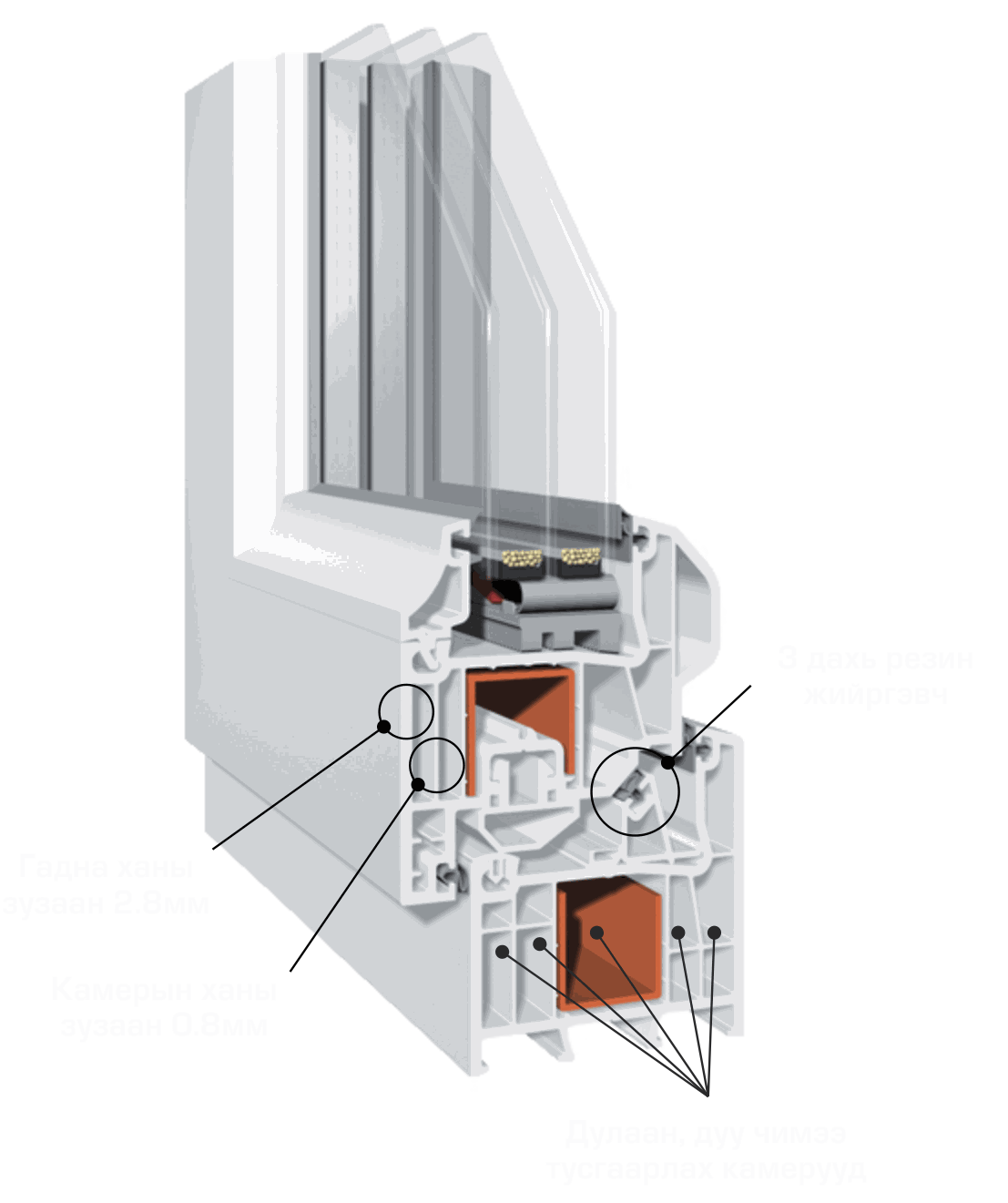 • PVC цонх хаалганы профилийн гадна ханын зузаан >=2.8мм, дотор камерын ханын зузаан >=0.8мм байвал өндөр үзүүлэлтэнд тооцогдоно