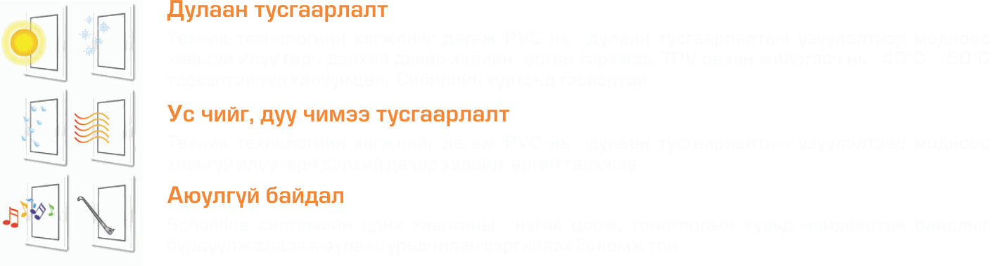 Шилмэл түүхий эд ашиглаж бүтээгдсэн, өндөр чанартай иж бүрдэлээр тоноглогдсон Schonline системийн цонх хаалганууд маань он жил өнгөрөх тусам таньд чанарыг мэдрүүлж, ташаал авчрах болно.