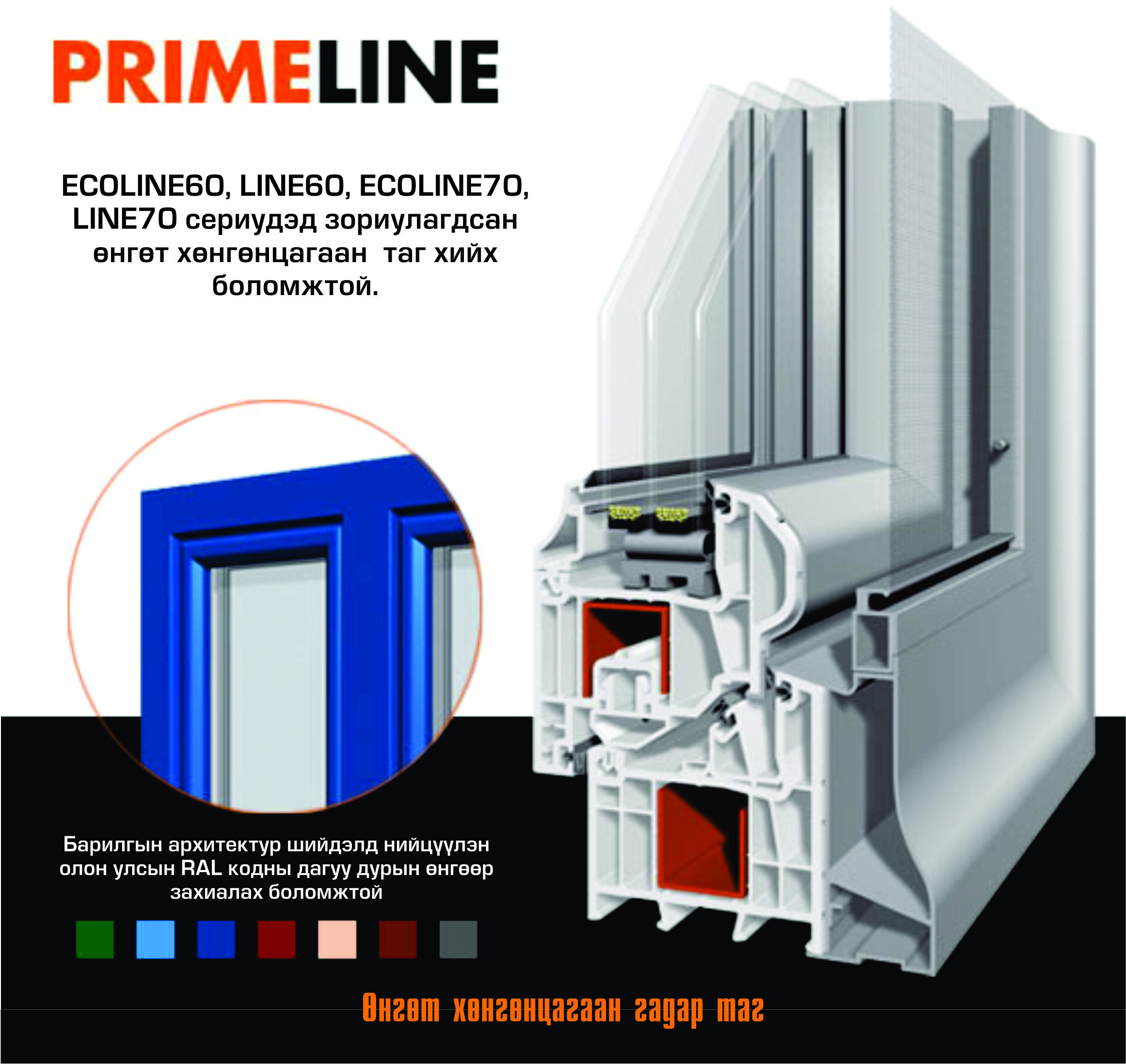 Бид Schonline брендийн Line 70 системийн хуванцар цонх хаалгыг үйлдвэрлэж байна. Line 70 нь 5 камертай, 70 мм-н зузаантай систем юм. Schonline системийн хуванцар цонх хаалга нь ижил төрлийн бүтээгдэхүүнүүдээс өвөрмөц дизайны шийдэл болон эстетик шинж чанаруудаараа ялгарахаас гадна жинхэнэ австри текнологид суурилсан өндөр чанараар эрс ялгарна.
